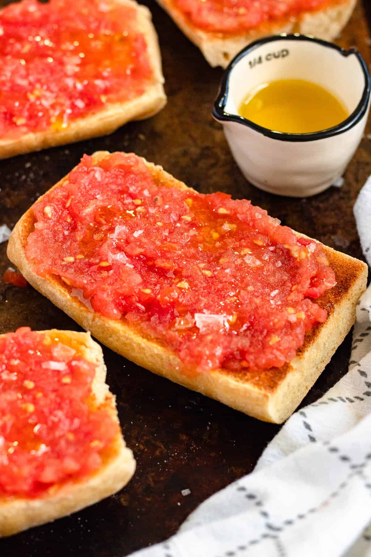 - Tomato Option 2: Spanish Method – Grate 2 roma tomatoes on the large setting of a cheese grater, turning it into a tomato pulp. Place the tomato pulp in a strainer to strain out any extra liquid. Then spoon the pulp onto the top of each piece of bread.