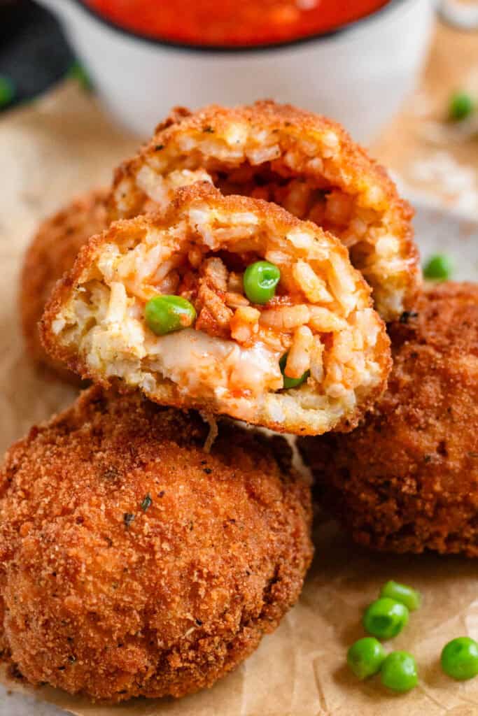 Picture golden, crispy on the outside and warm and cheesy on the inside. Arancini are one of Italy’s most beloved comfort foods. These Italian fried rice balls are filled with rich ragù, peas, and melty mozzarella, then coated in breadcrumbs and fried to perfection.