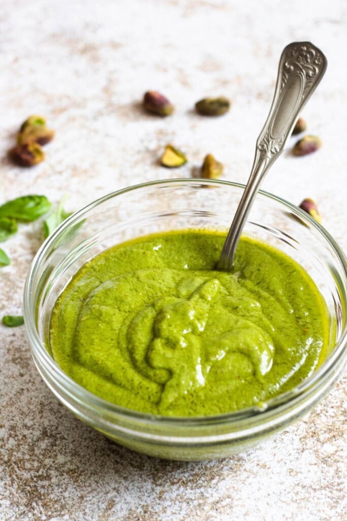 - If you don’t like pistachios, you can use walnuts (like in this Walnut Pesto Recipe), almonds, pine nuts, macadamia nuts, pecans, or anything else that sounds delicious